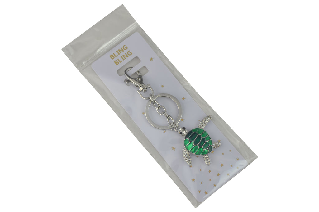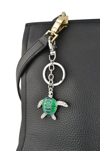 Keychain Charm Jeweled with Rhinestones - Sea Turtle in Silver and Green