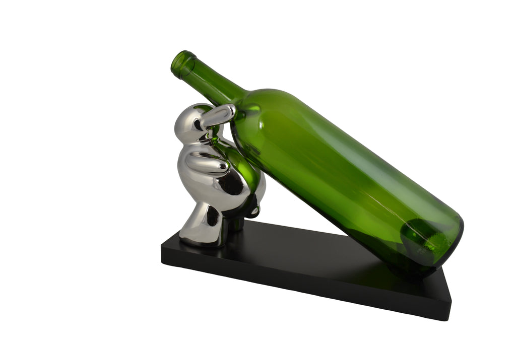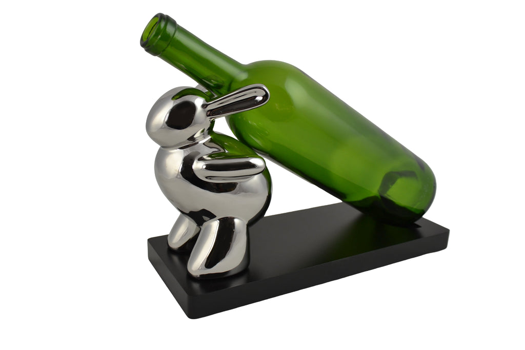 Silver metal wine bottle holder with black base in the shape of bunny or rabbit holding up the bottle, is a perfect gift for the wine lover or enthusiast in your life! Functional tabletop wine bottle rack fits one 750ml bottle of wine or liquor
