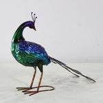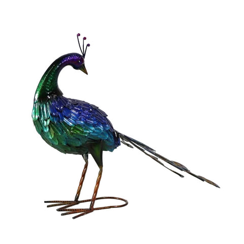 This garden statue peacock is 18 inches tall and adds a touch of modern style to your outdoor garden space. The metal green and blue peacock sculpture features a glossy finish and is weatherproof, making it durable and suitable for outdoor use. The peacock garden statue adds an inviting touch to your porch, flower bed, or lawn. Crafted from durable weatherproof metal, this life-size sculpture features a beautiful green and blue color that will complement any outdoor garden or patio decor. This peacock has a flat and sturdy stand that weighs 3lb, and has been pretreated to ensure no rusting. This sculpture is a great addition to any garden or outdoor living space and is perfect for animal lovers. Measures: 18" Tall x 24" Wide x 12" Deep