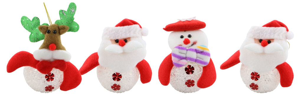 Celebrate Christmas with the ultimate 4-piece ornament set, including all the classic Christmas characters including 2 Santa Claus, 1 Snowman, and 1Rudolph. The ornaments are generously sized at 4-5” tall and they have a wonderfully warm crafty aesthetic.