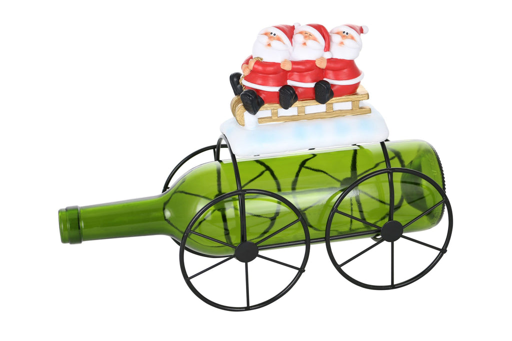 Figurine of a trio of tumbling Santa Clauses wine bottle holder. The colors are a festive red and white, making it perfect holiday and Christmas decor. It holds one standard 750 ml bottle of wine (bottle not included.) Poly resin figurine with a white base, approximately 8"x 7"it also makes a whimsical novelty gift.