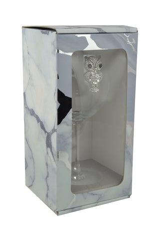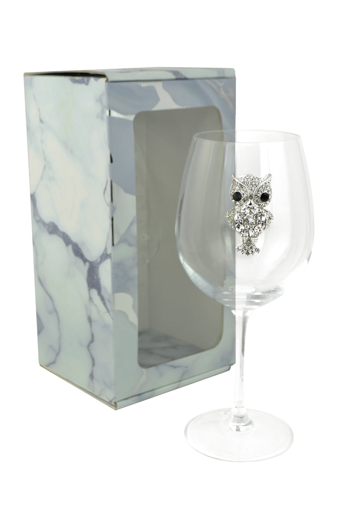 Large 18 Ounce Wine Glass with Silver Owl Rhinestone Emblem