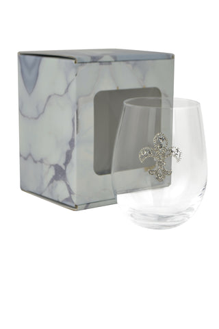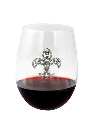 Large 18 oz Stemless Wine Glass with Silver Fleur de Lis Jewel
