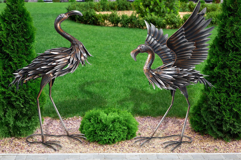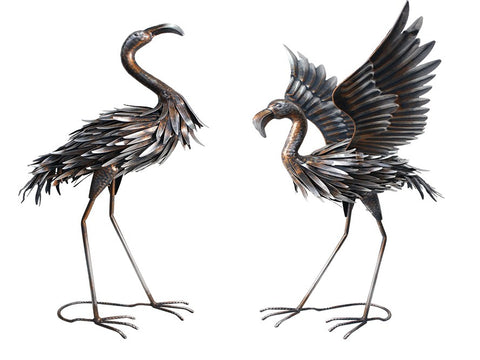 These garden statue flamingos are 26 inches tall. They will add a touch of modern style to your outdoor space with this pair of metal Flamingos. These sculptures feature a glossy finish and are weatherproof, making them durable and suitable for outdoor use. The flamingo garden statues add an inviting touch to your porch, flower bed, or lawn. Crafted from durable metal, these life-size sculptures are shaped like birds and feature a beautiful silver grey color that will complement any outdoor decor. The Flamingos come with a flat and sturdy stand, weigh 3 lb each and have been pretreated to ensure no rusting. These sculptures are a great addition to any garden or outdoor living space, perfect for animal lovers. Dims: 26" H x 20" W x 14" D and 37" H x 17" W x 8" D