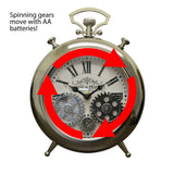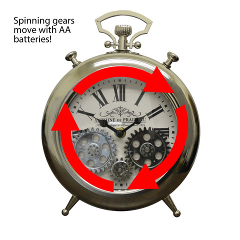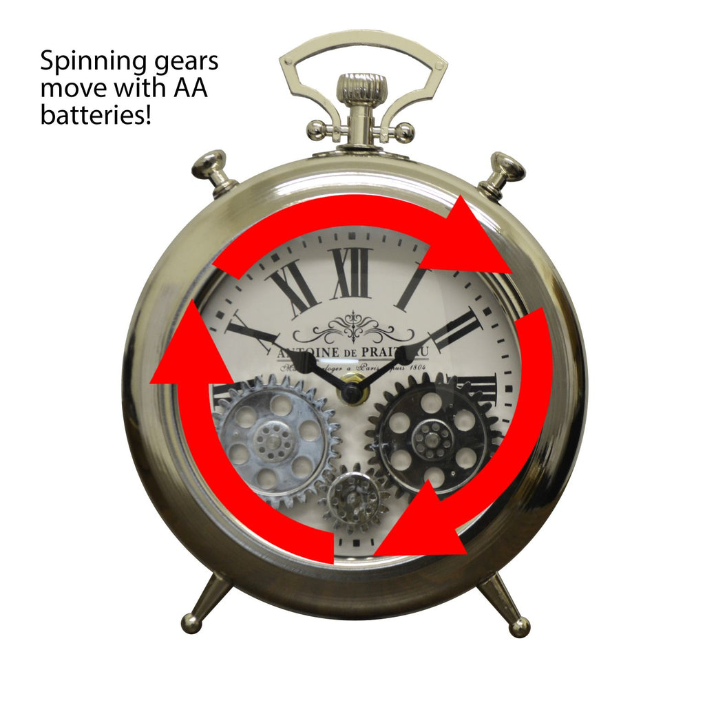 Classic silver metal table clock pocket style with moving gears and roman numerals. Dimensions are approximately 10” x 7” x 2" Depth and elegant table clock can accent any tabletop surface in home or office. Clock is powered by 3 AA batteries (not included with clock) - 2 batteries for the gears to start spinning, 1 battery for the clock hands to move to tell time. Clock stands upright on 3 legs, 2 in the front and 1 is in the back.