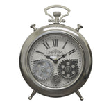 Classic silver metal table clock pocket style with moving gears and roman numerals. Item
