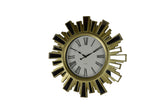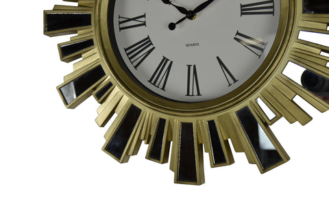 This 19.5" inch gold and mirror starburst wall clock makes a stunning statement in any room. This wall clock is a silent, non-ticking wall clock. With its battery-powered Quartz movement, it is sure to keep accurate time. This clock is powered by 2 AA batteries (not included) and comes ready to hang right out of the box. This clock is constructed of plastic and is lightweight and can easily be hung just about anywhere.